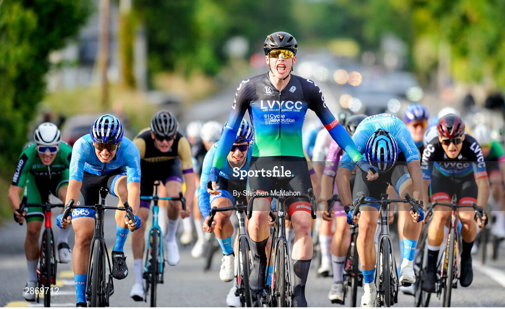 9 July 2024; Wiliam Gilbank of Lee Valley Youth CC team celebrates winning stage one of the 2024 Junior Tour of Ireland at the Maghera stage in Clare. Photo by Stephen McMahon/Sportsfile