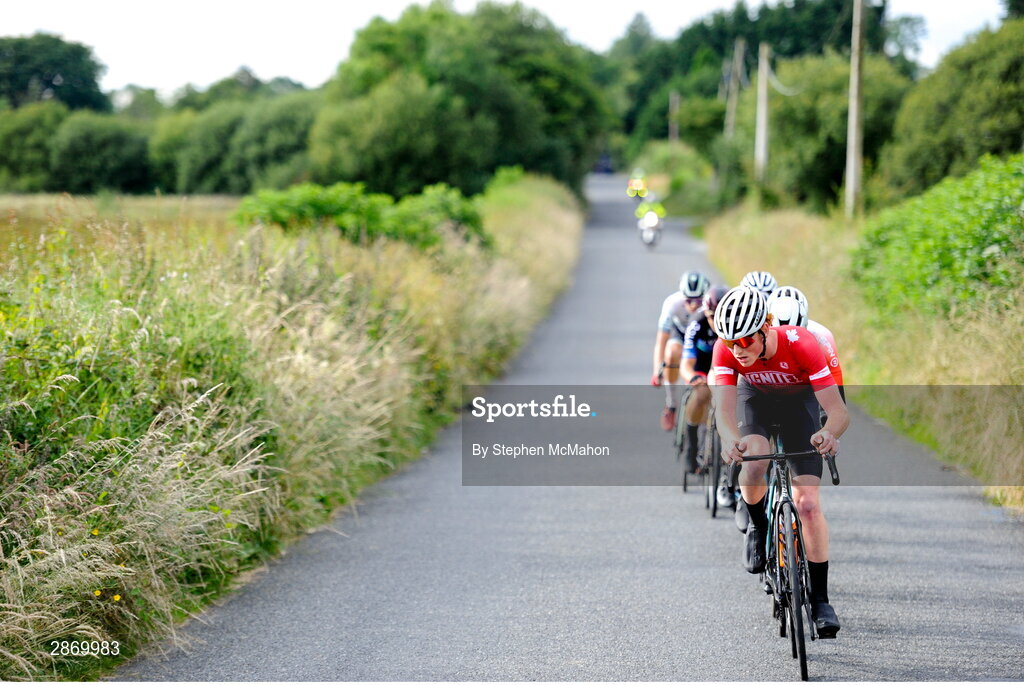 9 July 2024; Antoine Bergeron of Ignite Canada team leads the breakway during stage one of the 2024 Junior Tour of Ireland at the Maghera stage in Clare. Photo by Stephen McMahon/Sportsfile