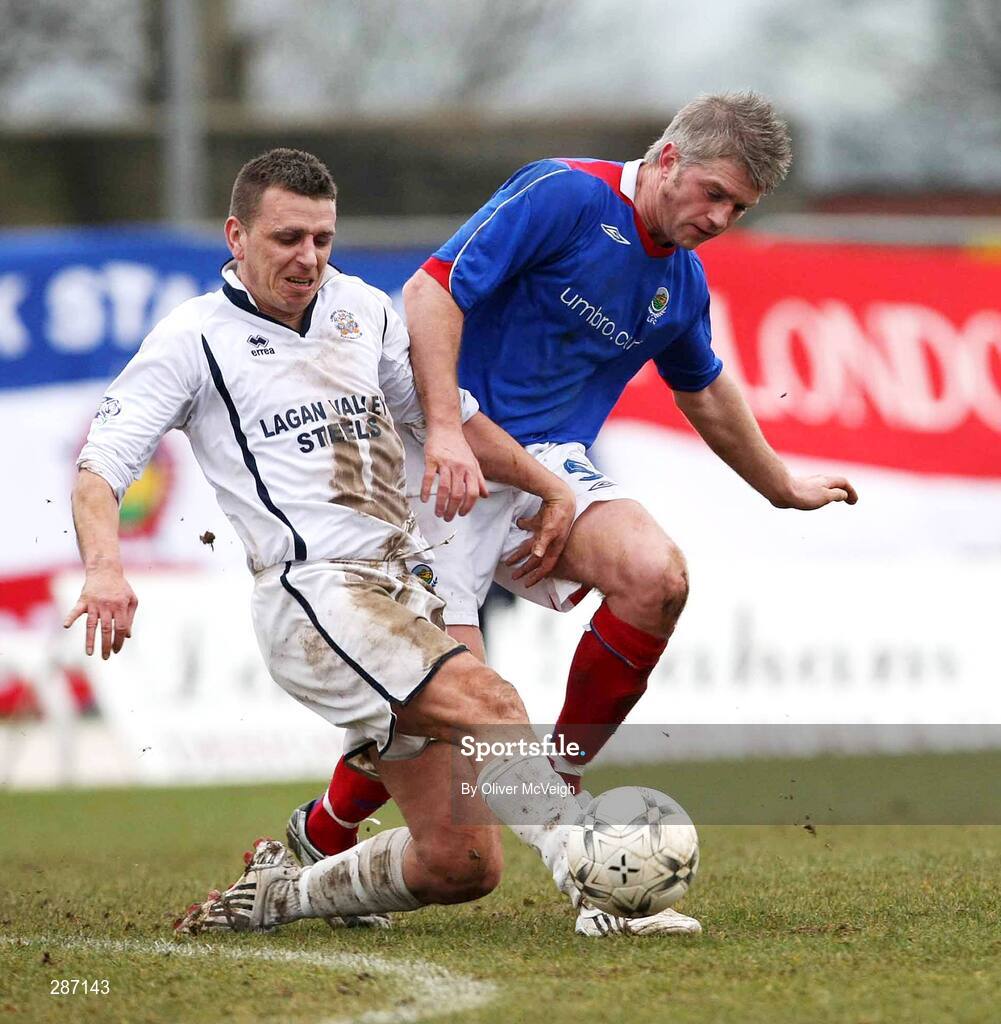 15 March 2008; Darren Armour, Lisburn Distillery, in action against William Murphy, Linfield. Carnegie Premier League, Lisburn Distillery v Linfield, Ballyskeagh, Lisburn, Co. Antrim. Picture credit; Oliver McVeigh / SPORTSFILE