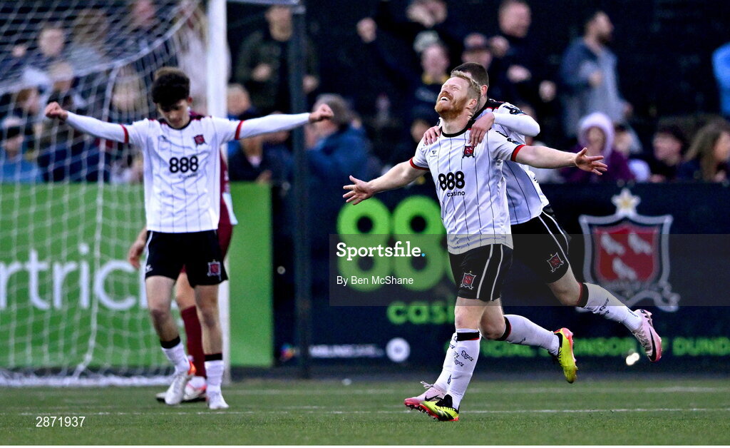 12 July 2024; Daryl Horgan of Dundalk celebrates with teammate Robbie Mahon, right, after scoring their side's fourth goal during the SSE Airtricity Men's Premier Division match between Dundalk and Drogheda United at Oriel Park in Dundalk, Louth. Photo by Ben McShane/Sportsfile