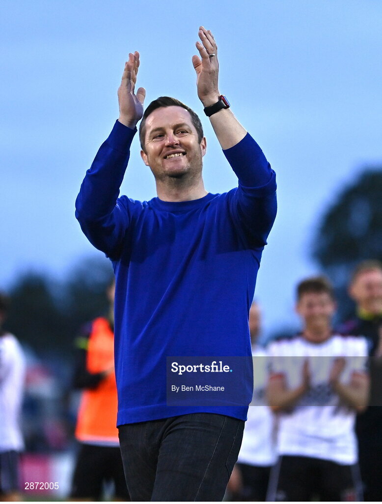 12 July 2024; Dundalk manager Jon Daly celebrates after the SSE Airtricity Men's Premier Division match between Dundalk and Drogheda United at Oriel Park in Dundalk, Louth. Photo by Ben McShane/Sportsfile