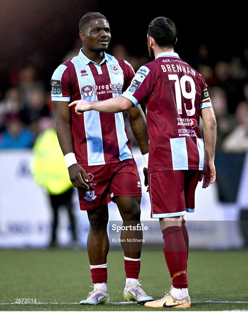 12 July 2024; Frantz Pierrot of Drogheda United, left, in conversation with teammate Ryan Brennan during the SSE Airtricity Men's Premier Division match between Dundalk and Drogheda United at Oriel Park in Dundalk, Louth. Photo by Ben McShane/Sportsfile