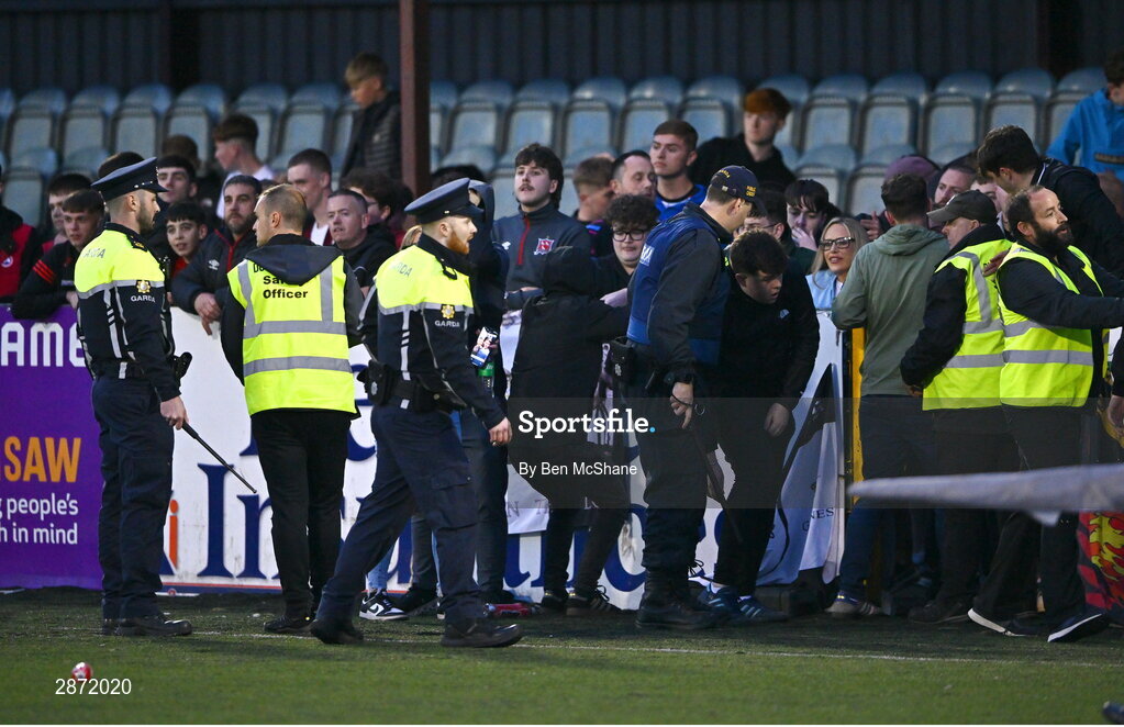 12 July 2024; Members of An Garda Síochána attempt to keep the peace as Drogheda United and Dundalk supporters fight at full-time of the SSE Airtricity Men's Premier Division match between Dundalk and Drogheda United at Oriel Park in Dundalk, Louth. Photo by Ben McShane/Sportsfile