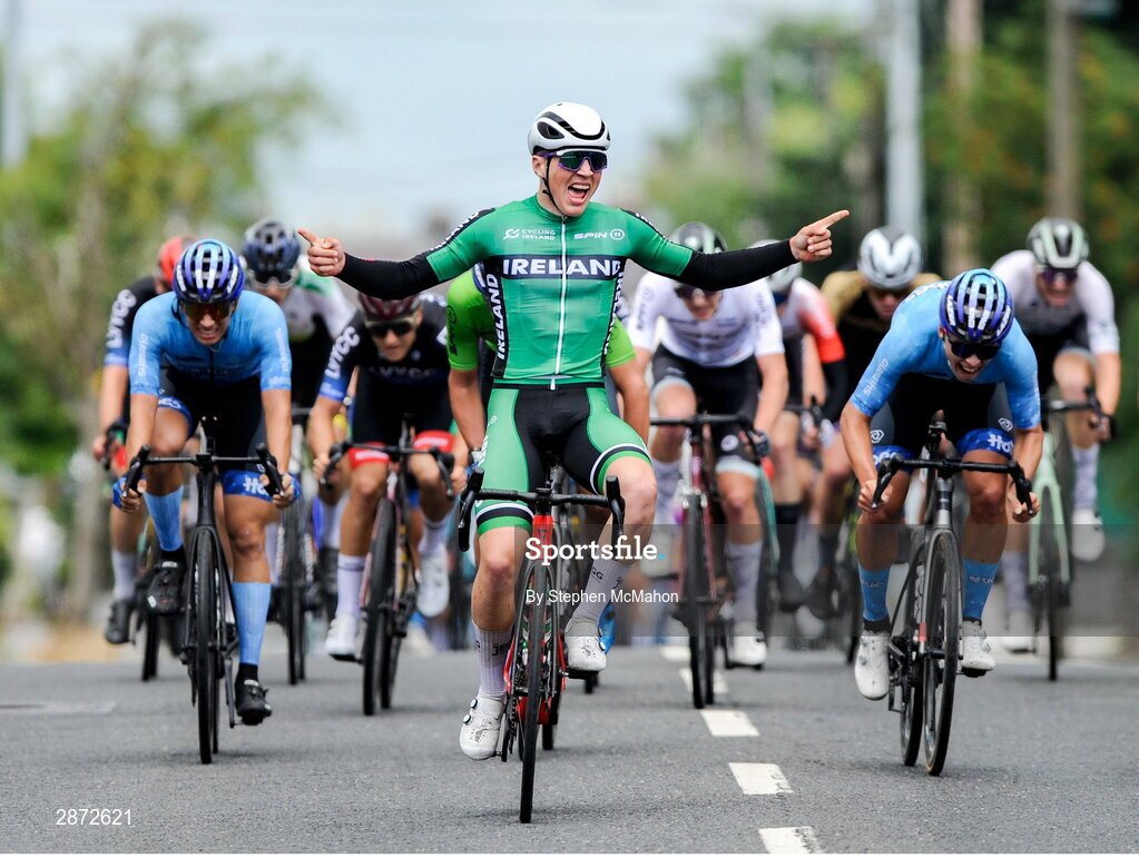 13 July 2024; Max Fitzgerald of Cycling Ireland team celebrates after winning stage five of the 2024 Junior Tour of Ireland at the East Clare stage in Clare. Photo by Stephen McMahon/Sportsfile