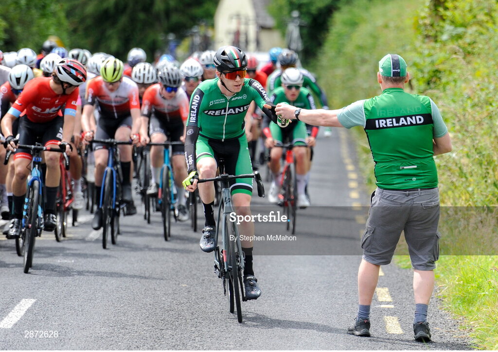 13 July 2024; Josh Callaly of Cycling Ireland team takes a water bottle during stage five of the 2024 Junior Tour of Ireland at the East Clare stage in Clare. Photo by Stephen McMahon/Sportsfile