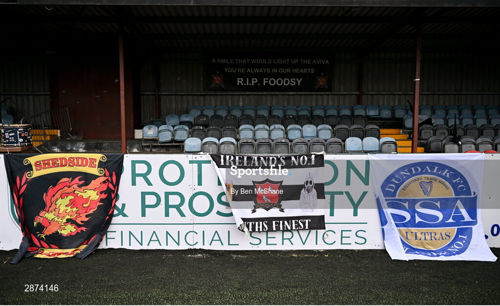 12 July 2024; Dundalk supporter flags are seen before the SSE Airtricity Men's Premier Division match between Dundalk and Drogheda United at Oriel Park in Dundalk, Louth. Photo by Ben McShane/Sportsfile