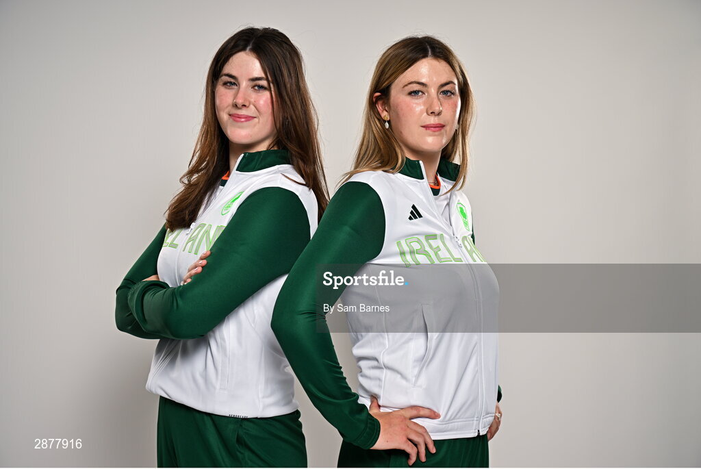 16 July 2024; Michaela Corcoran, left, with her sister Madison Corcoran during the Team Ireland Paris 2024 team announcement for Canoeing at The Crowne Plaza Hotel in Blanchardstown, Dublin. Photo by Sam Barnes/Sportsfile