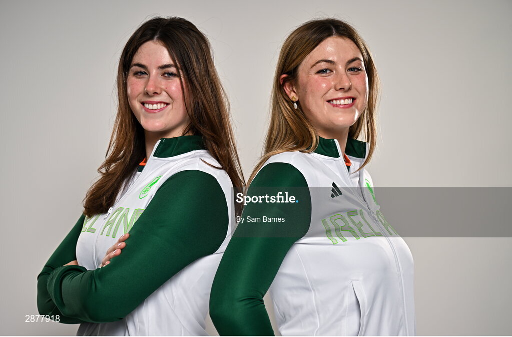 16 July 2024; Michaela Corcoran, left, with her sister Madison Corcoran during the Team Ireland Paris 2024 team announcement for Canoeing at The Crowne Plaza Hotel in Blanchardstown, Dublin. Photo by Sam Barnes/Sportsfile