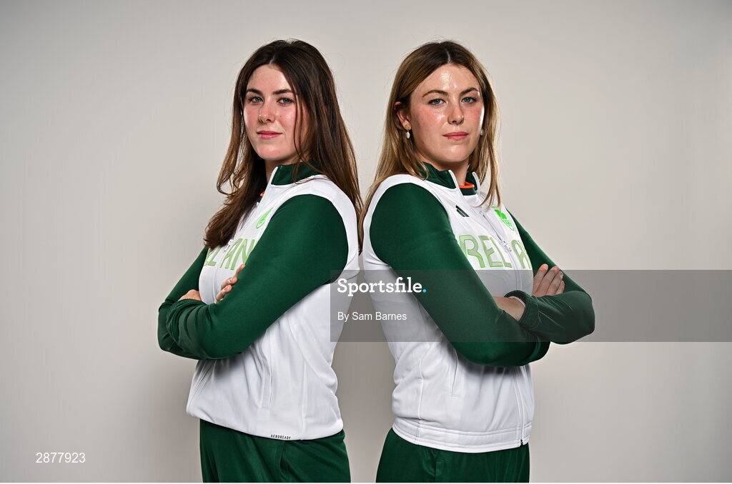 16 July 2024; Michaela Corcoran, left, with her sister Madison Corcoran during the Team Ireland Paris 2024 team announcement for Canoeing at The Crowne Plaza Hotel in Blanchardstown, Dublin. Photo by Sam Barnes/Sportsfile