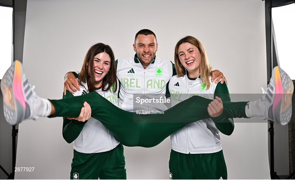 16 July 2024; Michaela Corcoran, Liam Jegou and Madison Corcoran during the Team Ireland Paris 2024 team announcement for Canoeing at The Crowne Plaza Hotel in Blanchardstown, Dublin. Photo by Sam Barnes/Sportsfile