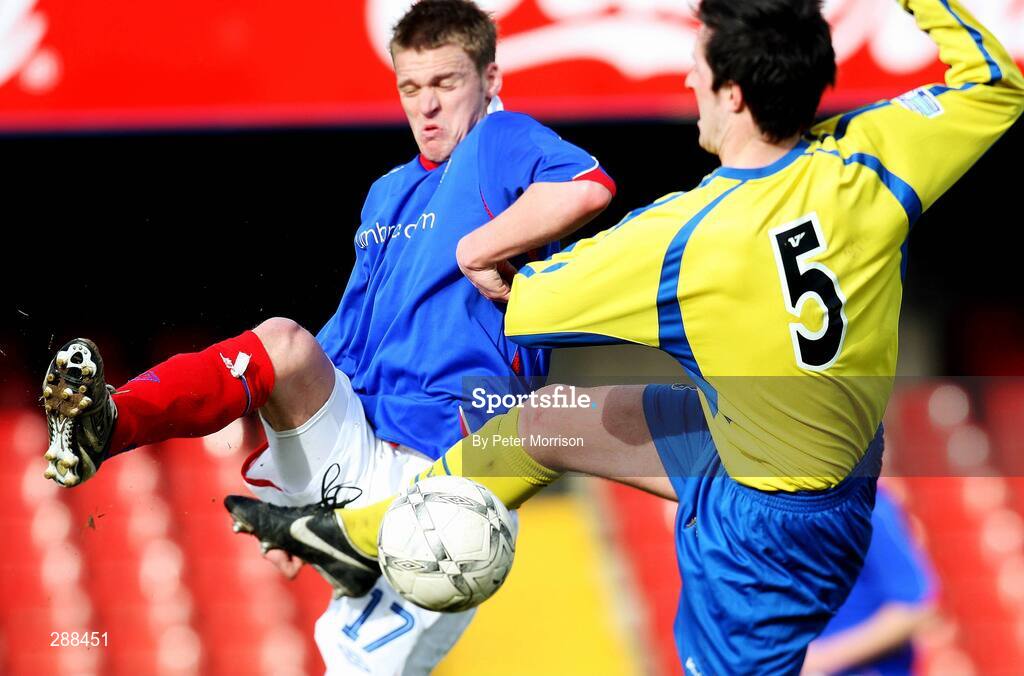 22 March 2008; Peter Thompson, Linfield, in action against Ruairi McClean, Institute. Carnegie Premier League, Linfield v Institute, Windsor Park, Belfast, Co. Antrim. Picture credit; Peter Morrison / SPORTSFILE