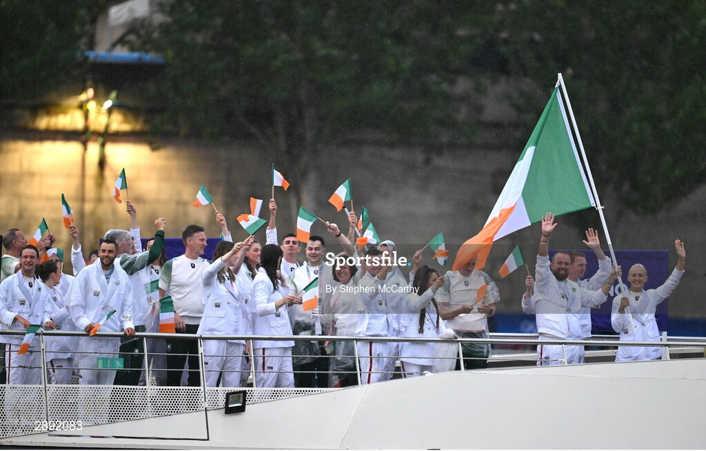 26 July 2024; Team Ireland, led by flagbearers Shane Lowry and Sarah Lavin, during the Opening Ceremony of the 2024 Paris Summer Olympic Games on the banks of the river Seine in Paris, France. Photo by Stephen McCarthy/Sportsfile