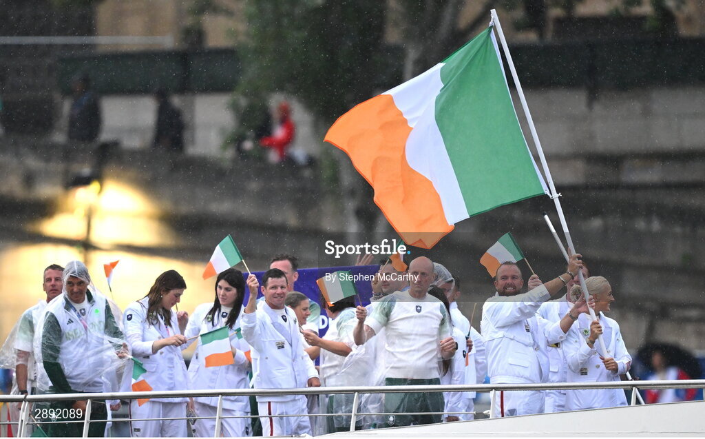 26 July 2024; Team Ireland, led by flagbearers Shane Lowry and Sarah Lavin, during the Opening Ceremony of the 2024 Paris Summer Olympic Games on the banks of the river Seine in Paris, France. Photo by Stephen McCarthy/Sportsfile