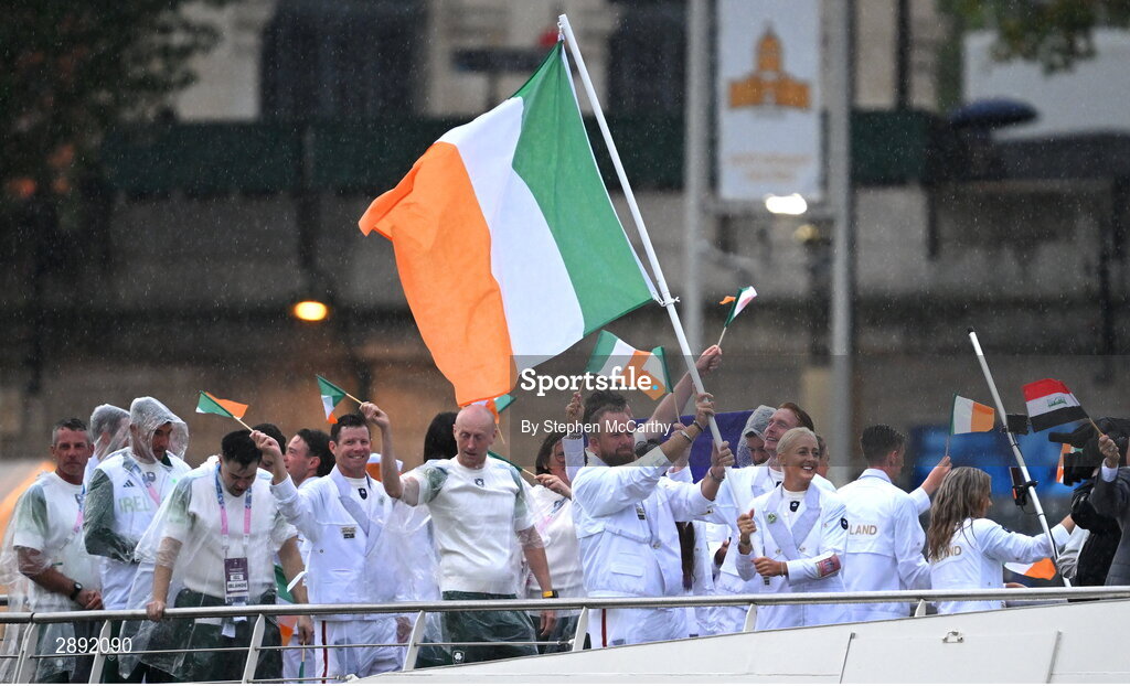 26 July 2024; Team Ireland, led by flagbearers Shane Lowry and Sarah Lavin, during the Opening Ceremony of the 2024 Paris Summer Olympic Games on the banks of the river Seine in Paris, France. Photo by Stephen McCarthy/Sportsfile