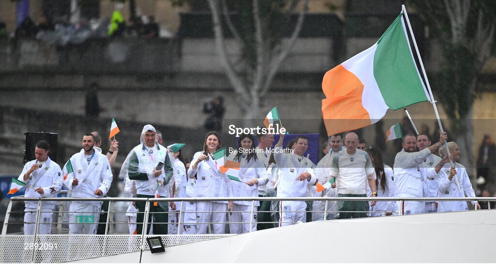 26 July 2024; Team Ireland, led by flagbearers Shane Lowry and Sarah Lavin, during the Opening Ceremony of the 2024 Paris Summer Olympic Games on the banks of the river Seine in Paris, France. Photo by Stephen McCarthy/Sportsfile
