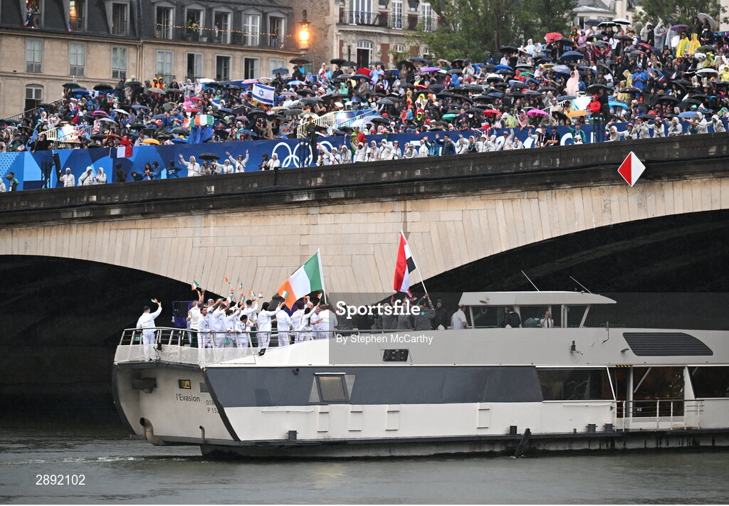 26 July 2024; Team Ireland and Team Iraq during the Opening Ceremony of the 2024 Paris Summer Olympic Games on the banks of the river Seine in Paris, France. Photo by Stephen McCarthy/Sportsfile