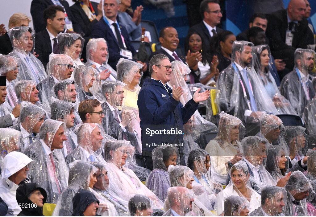 26 July 2024; British Prime Minister Sir Keir Starmer MP, in the company of An Taoiseach Simon Harris TD, applauds Team Great Britain during the Opening Ceremony of the 2024 Paris Summer Olympic Games at the Trocadero in Paris, France. Photo by David Fitzgerald/Sportsfile