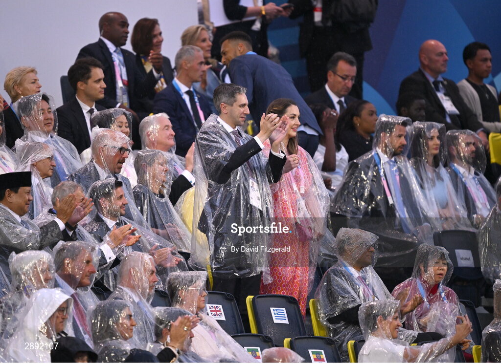 26 July 2024; An Taoiseach Simon Harris TD, and his wife Caoimhe Wade applaud Team Ireland during the Opening Ceremony of the 2024 Paris Summer Olympic Games at the Trocadero in Paris, France. Photo by David Fitzgerald/Sportsfile