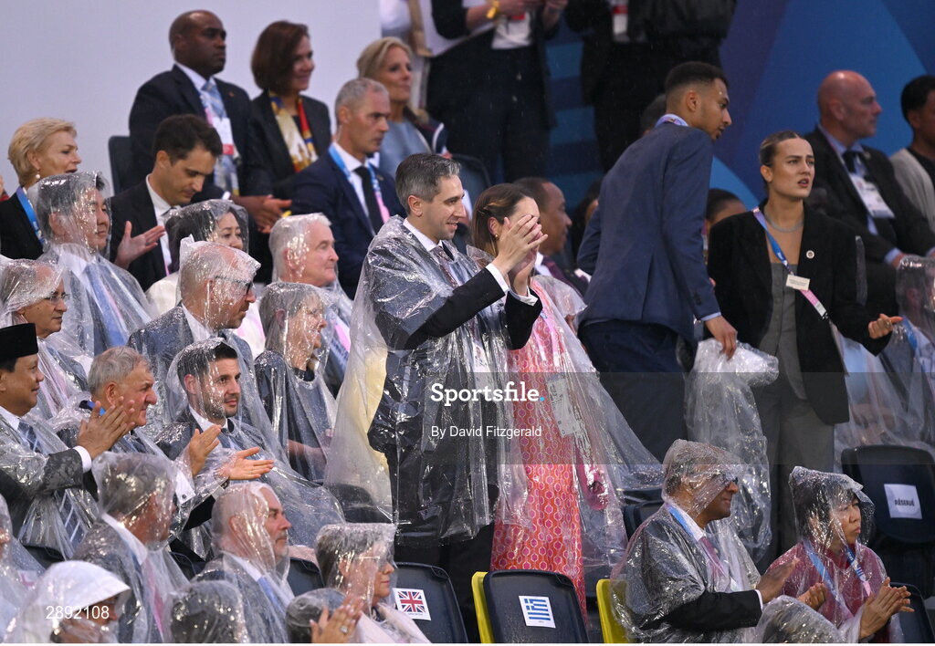 26 July 2024; An Taoiseach Simon Harris TD, and his wife Caoimhe Wade applaud Team Ireland during the Opening Ceremony of the 2024 Paris Summer Olympic Games at the Trocadero in Paris, France. Photo by David Fitzgerald/Sportsfile