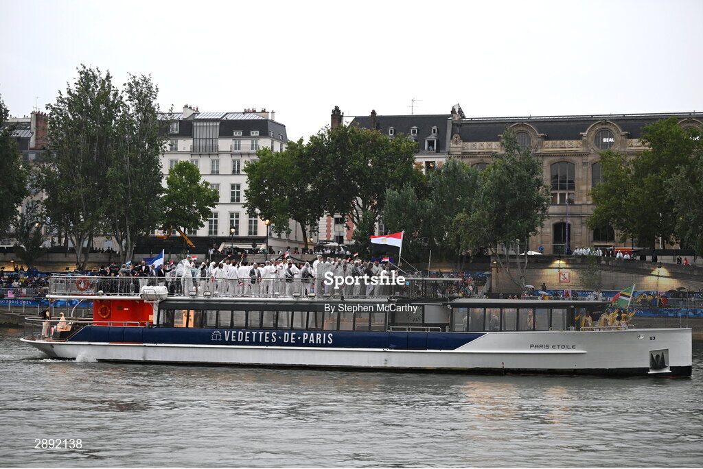 26 July 2024; Teams Dominica, Egypt and El Salvador during the Opening Ceremony of the 2024 Paris Summer Olympic Games on the banks of the river Seine in Paris, France. Photo by Stephen McCarthy/Sportsfile