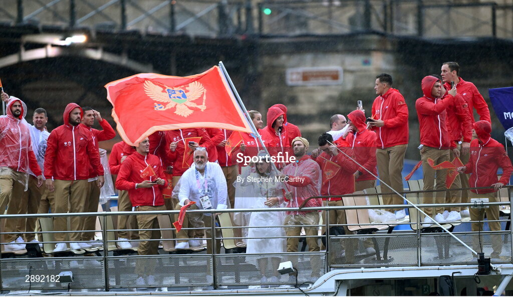 26 July 2024; Team Montenegro, led by flagbearers Milivoj Dukic and Danka Kovinic, during the Opening Ceremony of the 2024 Paris Summer Olympic Games on the banks of the river Seine in Paris, France. Photo by Stephen McCarthy/Sportsfile