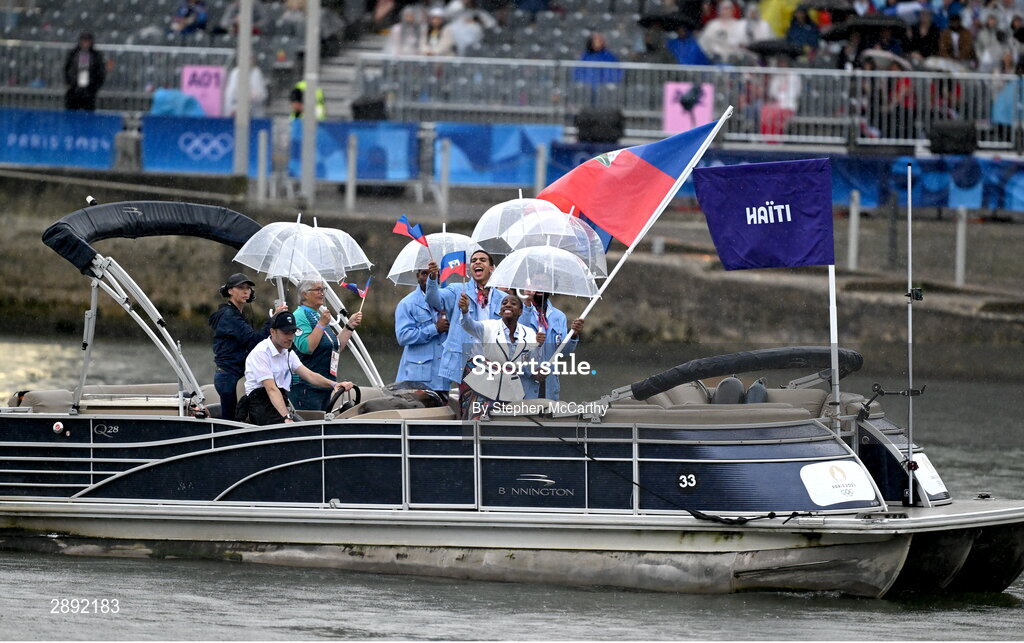 26 July 2024; Team Haiti, led by flagbearers Lynnzee Brown and Philippe Abel Metellus, during the Opening Ceremony of the 2024 Paris Summer Olympic Games on the banks of the river Seine in Paris, France. Photo by Stephen McCarthy/Sportsfile