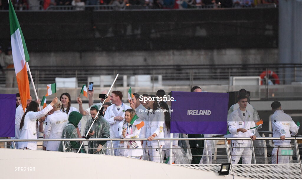 26 July 2024; Team Ireland, led by flagbearers Shane Lowry and Sarah Lavin, during the Opening Ceremony of the 2024 Paris Summer Olympic Games on the banks of the river Seine in Paris, France. Photo by Anthony Bibard/Sportsfile