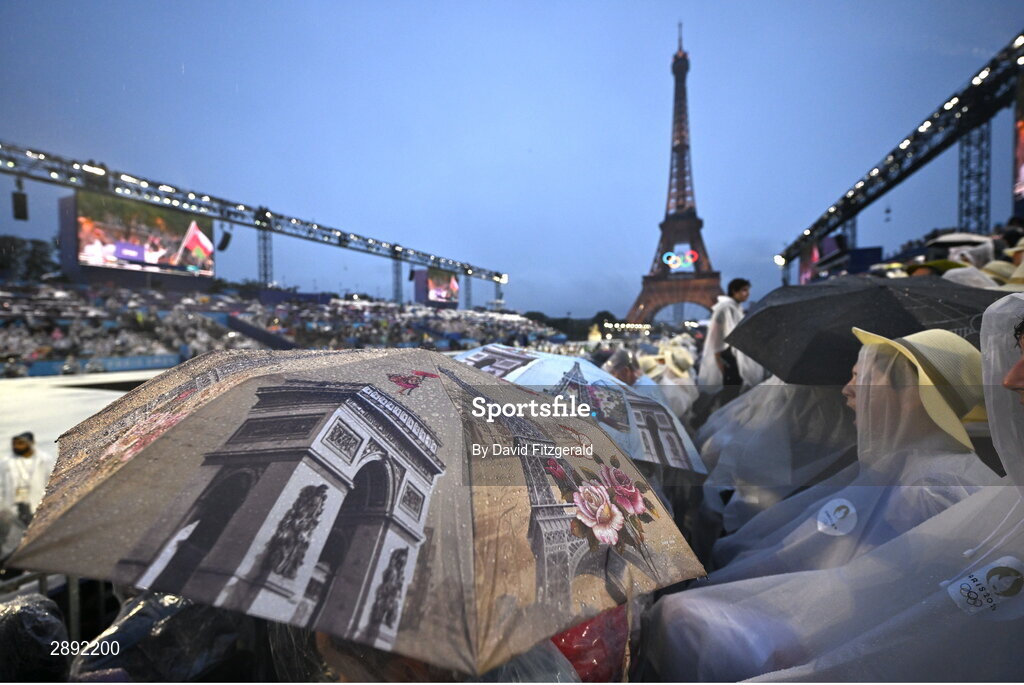26 July 2024; Spectators shield themselves from the rain during the Opening Ceremony of the 2024 Paris Summer Olympic Games at the Trocadero in Paris, France. Photo by David Fitzgerald/Sportsfile