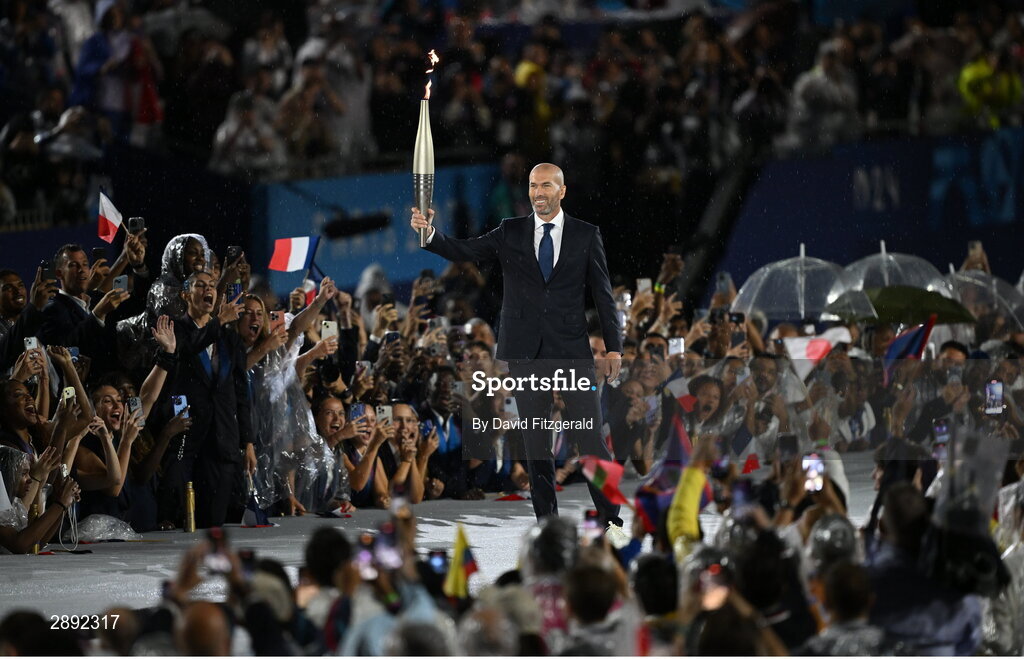 26 July 2024; Former French footballer Zinedine Zidane carrys the torch during the Opening Ceremony of the 2024 Paris Summer Olympic Games at the Trocadero in Paris, France. Photo by David Fitzgerald/Sportsfile