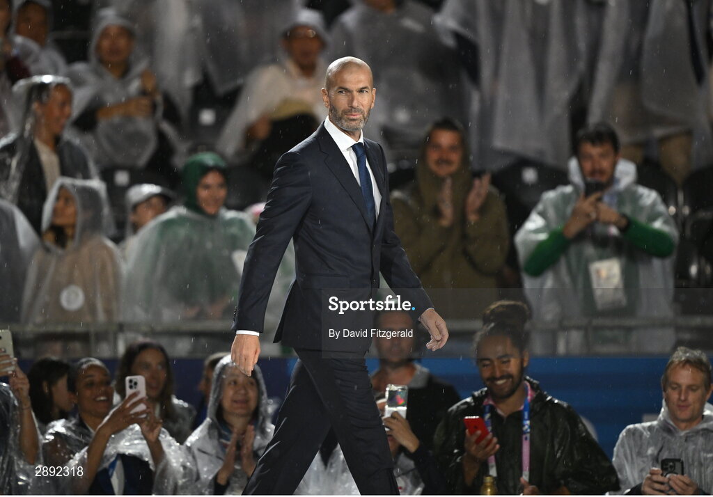26 July 2024; Former French footballer Zinedine Zidane carrys the torch during the Opening Ceremony of the 2024 Paris Summer Olympic Games at the Trocadero in Paris, France. Photo by David Fitzgerald/Sportsfile