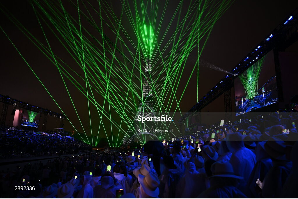 26 July 2024; A general view of the lights display coming from the Eiffel Tower during the Opening Ceremony of the 2024 Paris Summer Olympic Games at the Trocadero in Paris, France. Photo by David Fitzgerald/Sportsfile