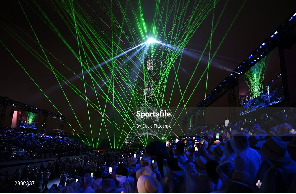 26 July 2024; A general view of the lights display coming from the Eiffel Tower during the Opening Ceremony of the 2024 Paris Summer Olympic Games at the Trocadero in Paris, France. Photo by David Fitzgerald/Sportsfile