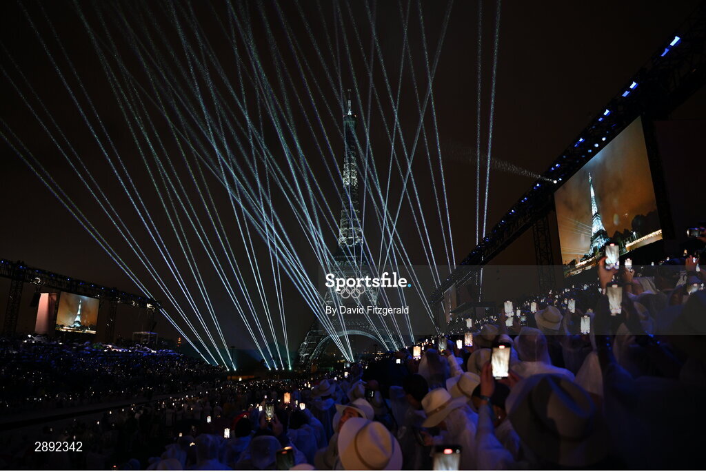 26 July 2024; A general view of the lights display coming from the Eiffel Tower during the Opening Ceremony of the 2024 Paris Summer Olympic Games at the Trocadero in Paris, France. Photo by David Fitzgerald/Sportsfile
