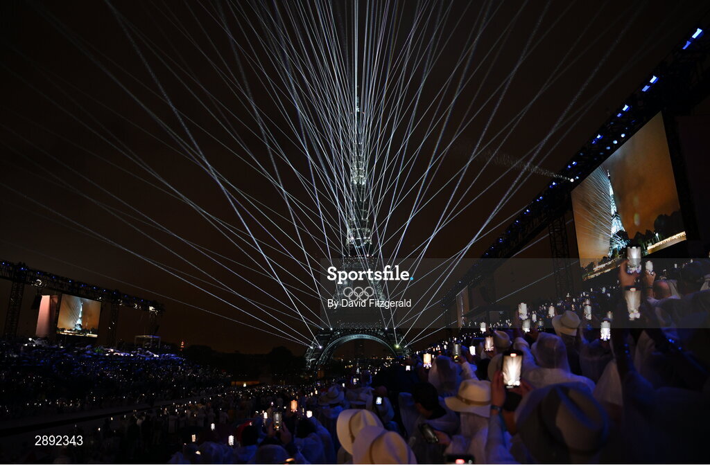 26 July 2024; A general view of the lights display coming from the Eiffel Tower during the Opening Ceremony of the 2024 Paris Summer Olympic Games at the Trocadero in Paris, France. Photo by David Fitzgerald/Sportsfile