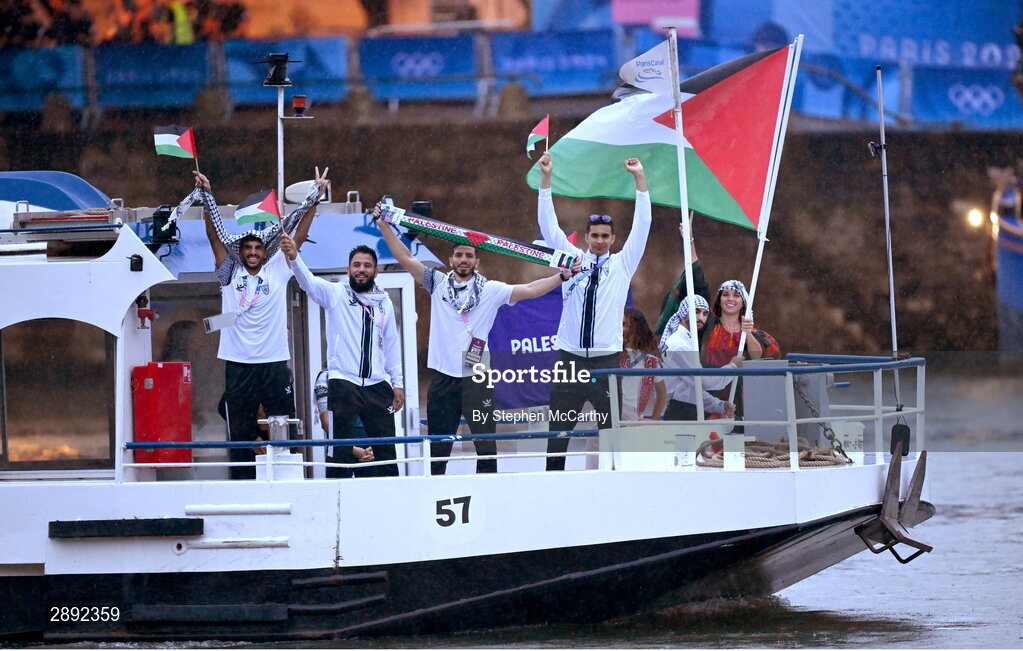 26 July 2024; Team Palestine led by flagbearers Wasim Abusal and Valerie Rose Tarazi during the Opening Ceremony of the 2024 Paris Summer Olympic Games on the banks of the river Seine in Paris, France. Photo by Stephen McCarthy/Sportsfile