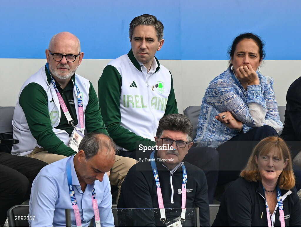 27 July 2024; An Taoiseach Simon Harris TD, centre, Minister for Media, Tourism, Arts, Culture, Sport and the Gaeltacht, Catherine Martin T.D., right, and Chief executive of Sport Ireland Dr Úna May, bottom right, during the men's pool B match between Team Ireland and Team Belgium at the Yves-du-Manoir Stadium during the 2024 Paris Summer Olympic Games in Paris, France. Photo by David Fitzgerald/Sportsfile