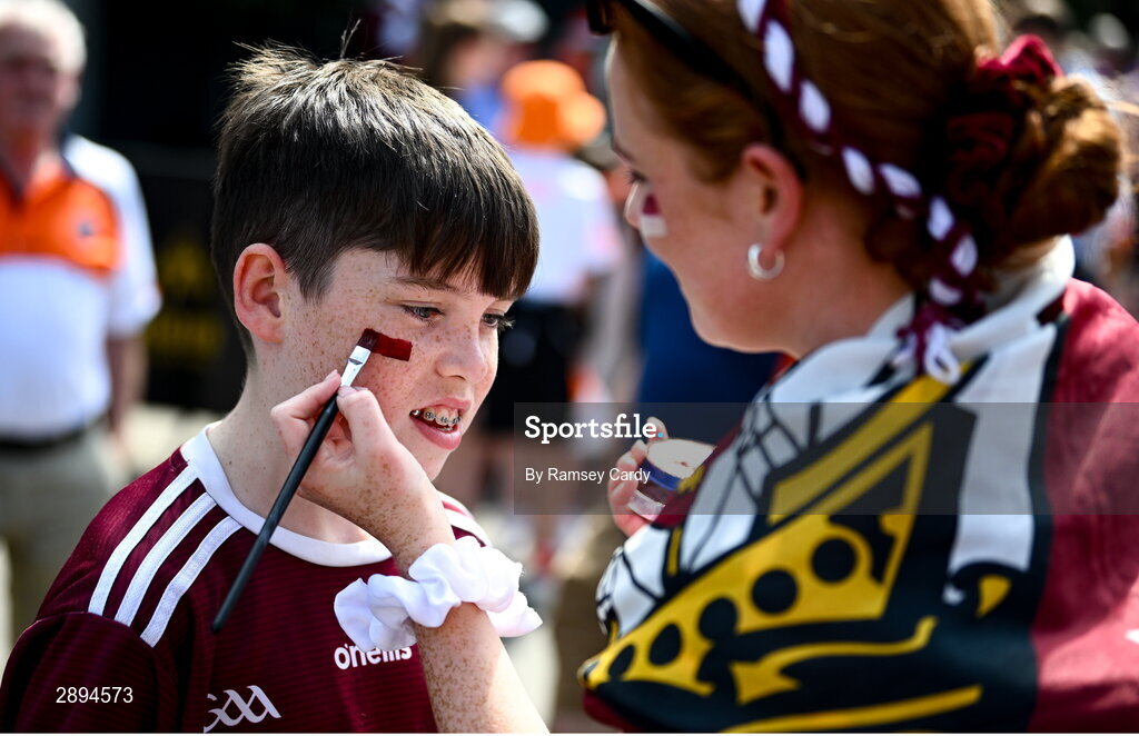 28 July 2024; Galway supporter Colin Higgins, has his face painted by cousin Kate Boylan, before the GAA Football All-Ireland Senior Championship Final match between Armagh and Galway at Croke Park in Dublin. Photo by Ramsey Cardy/Sportsfile