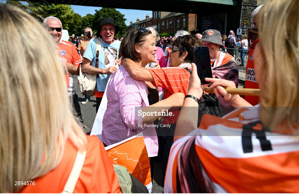 28 July 2024; The family and friends of Natalie McNally, who walked from Craigavon, Armagh, to Croke Park, with Leader of Sinn Féin Mary Lou McDonald TD before the GAA Football All-Ireland Senior Championship Final match between Armagh and Galway at Croke Park in Dublin. Photo by Ramsey Cardy/Sportsfile