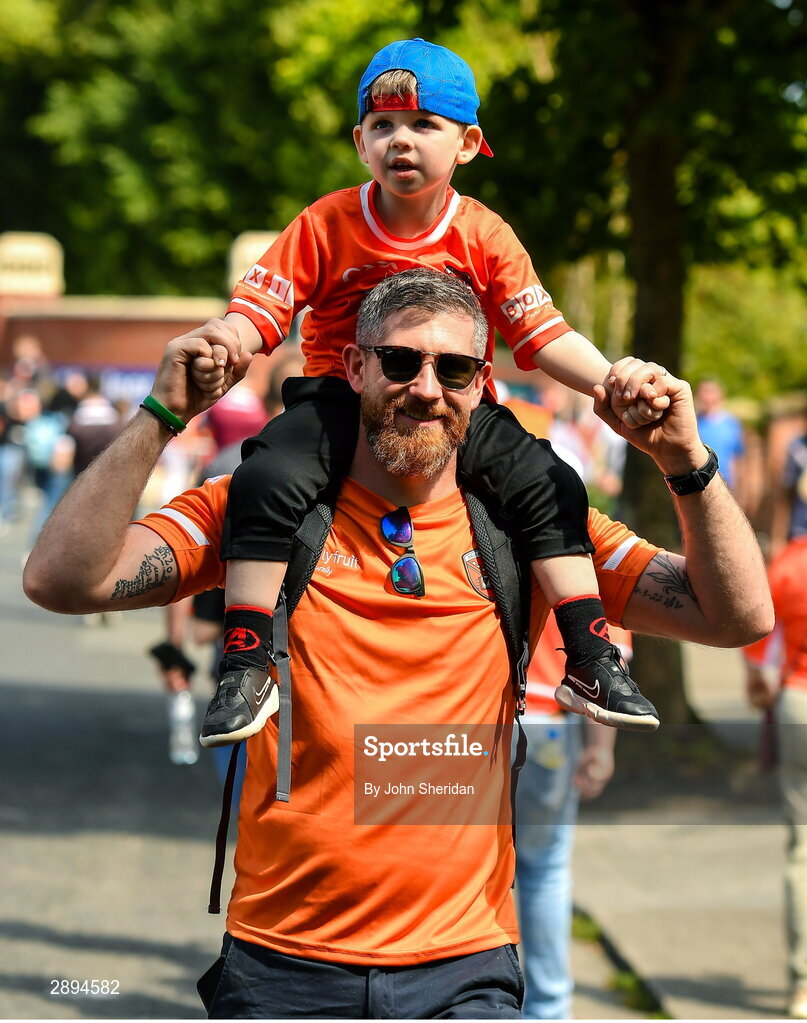 28 July 2024; Armagh supporters, Paddy Doran and his son Leweyn, top, make their way down Jone's Road before the GAA Football All-Ireland Senior Championship Final match between Armagh and Galway at Croke Park in Dublin. Photo by John Sheridan/Sportsfile