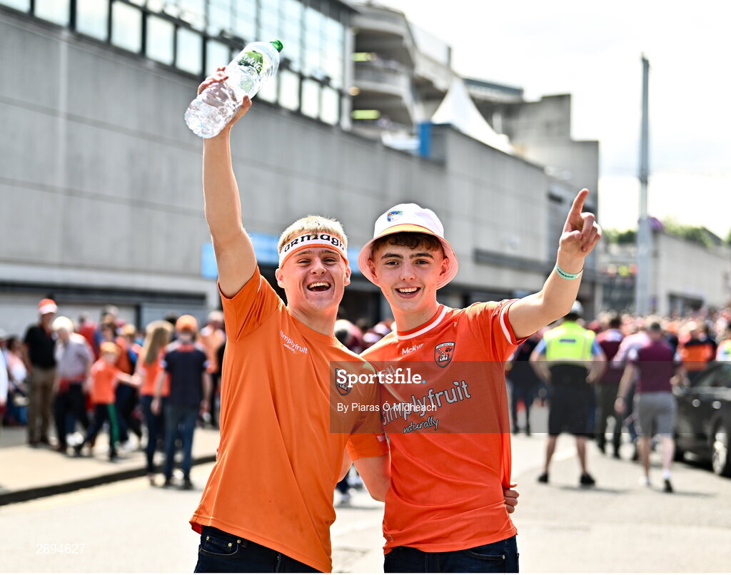 28 July 2024; Armagh supporters Lewis Bellew, from Cullyhanna, left, and Shea Bellew, from Crossmaglen, before the GAA Football All-Ireland Senior Championship Final match between Armagh and Galway at Croke Park in Dublin. Photo by Piaras Ó Mídheach/Sportsfile
