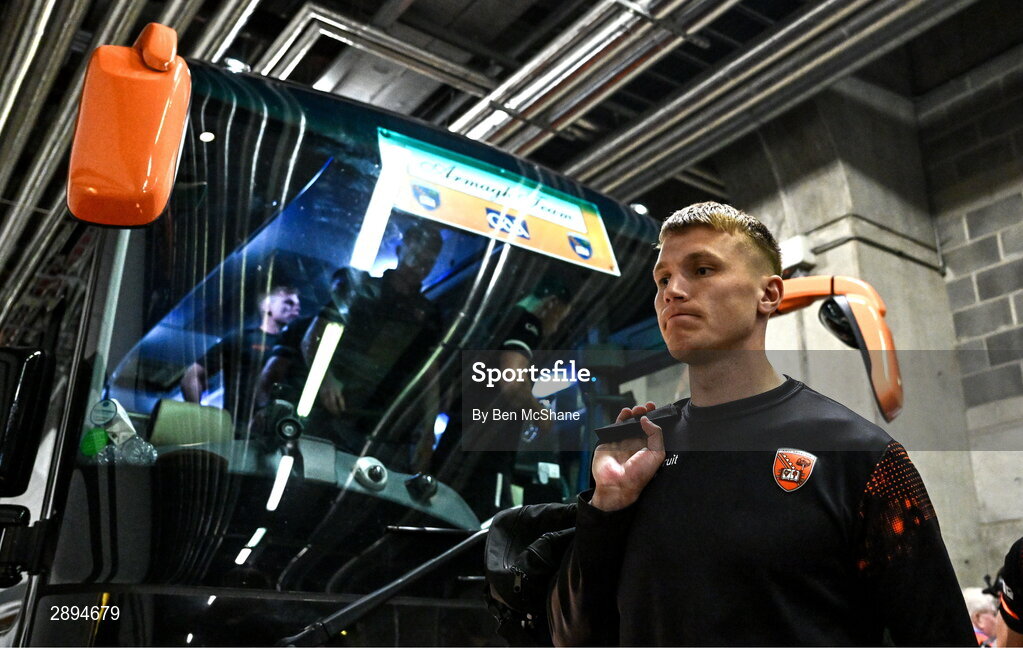 28 July 2024; Rian O'Neill of Armagh arrives before the GAA Football All-Ireland Senior Championship Final match between Armagh and Galway at Croke Park in Dublin. Photo by Ben McShane/Sportsfile