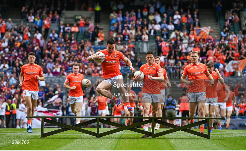28 July 2024; Armagh captain Aidan Forker, centre, jumps over the bench before having the Armagh team photograph taken before the GAA Football All-Ireland Senior Championship Final match between Armagh and Galway at Croke Park in Dublin. Photo by Ben McShane/Sportsfile