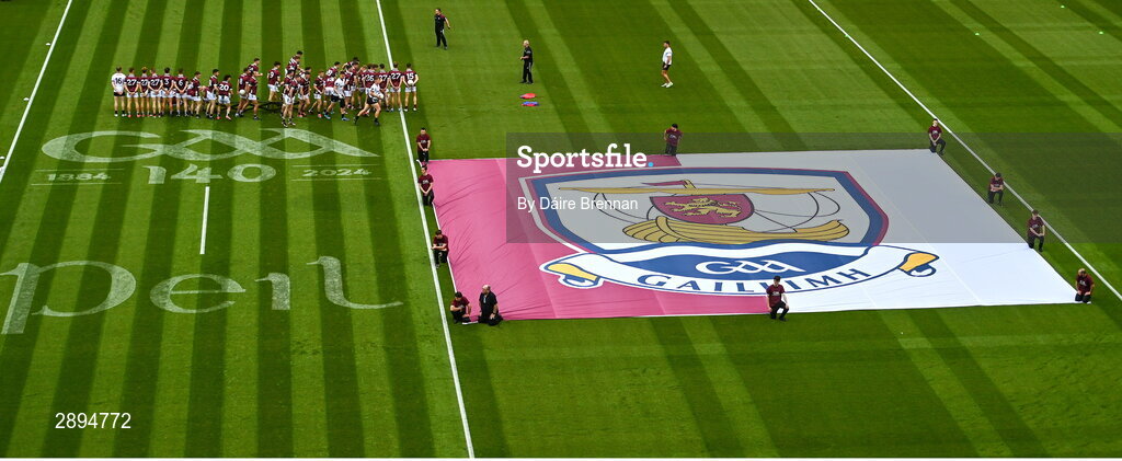 28 July 2024; The Galway team break from the team photo ahead of the GAA Football All-Ireland Senior Championship Final match between Armagh and Galway at Croke Park in Dublin. Photo by Daire Brennan/Sportsfile