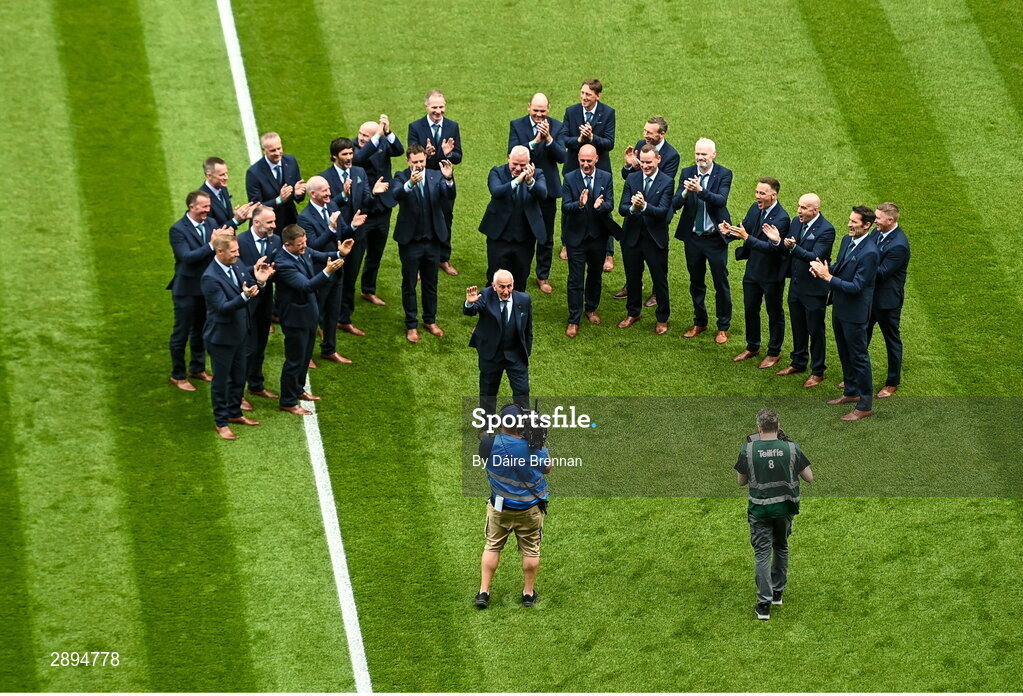 28 July 2024; The Meath team form a guard of honour around manager Seán Boylan during the 1999 All-Ireland winning Meath football football jubilee celebration before the GAA Football All-Ireland Senior Championship Final match between Armagh and Galway at Croke Park in Dublin. Photo by Daire Brennan/Sportsfile