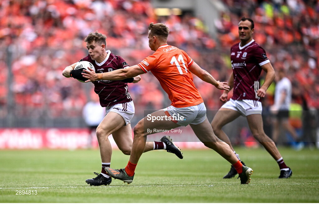 28 July 2024; Johnny McGrath of Galway in action against Rian O'Neill of Armagh during the GAA Football All-Ireland Senior Championship Final match between Armagh and Galway at Croke Park in Dublin. Photo by Ramsey Cardy/Sportsfile