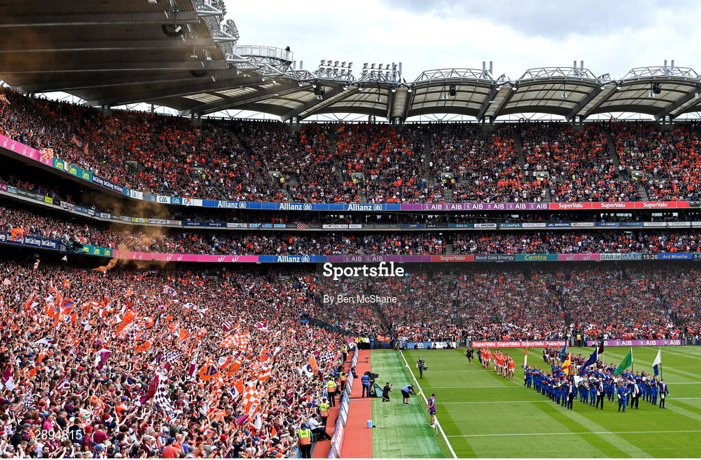 28 July 2024; The Artane Band lead the pre-match parade before the GAA Football All-Ireland Senior Championship Final match between Armagh and Galway at Croke Park in Dublin. Photo by Ben McShane/Sportsfile