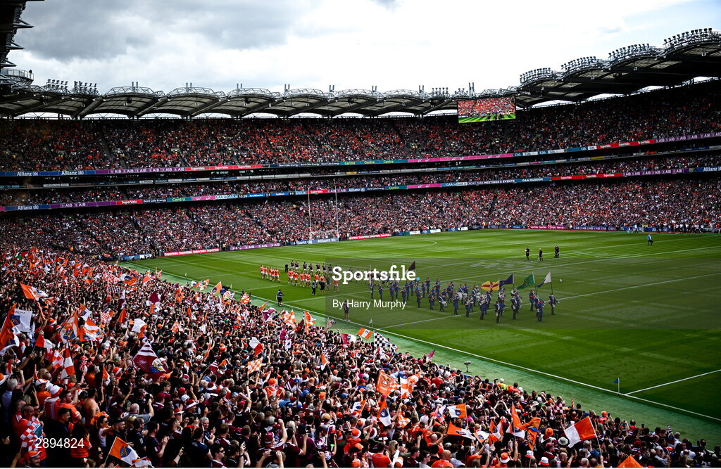 28 July 2024; Armagh and Galway players parade before the GAA Football All-Ireland Senior Championship Final match between Armagh and Galway at Croke Park in Dublin. Photo by Harry Murphy/Sportsfile