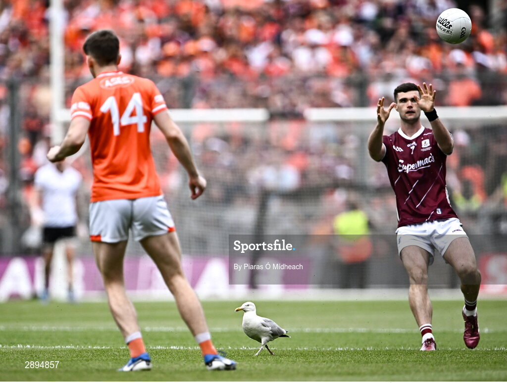 28 July 2024; Séan Mulkerrin of Galway gathers possession ahead of Andrew Murnin of Armagh, as a seagull plays a roving role, during the GAA Football All-Ireland Senior Championship Final match between Armagh and Galway at Croke Park in Dublin. Photo by Piaras Ó Mídheach/Sportsfile