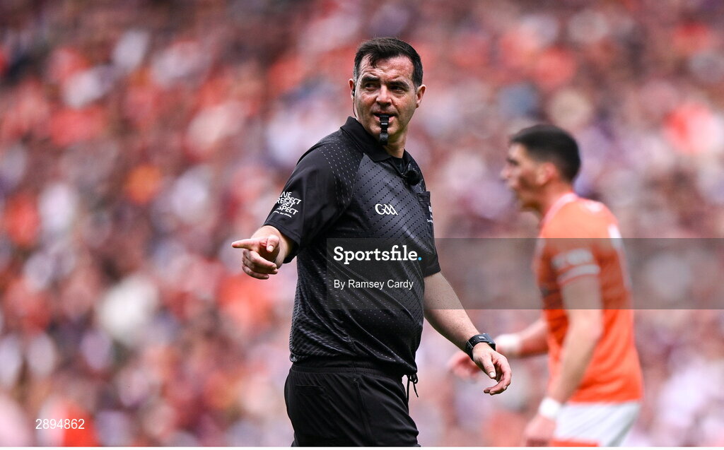 28 July 2024; Referee Sean Hurson during the GAA Football All-Ireland Senior Championship Final match between Armagh and Galway at Croke Park in Dublin. Photo by Ramsey Cardy/Sportsfile