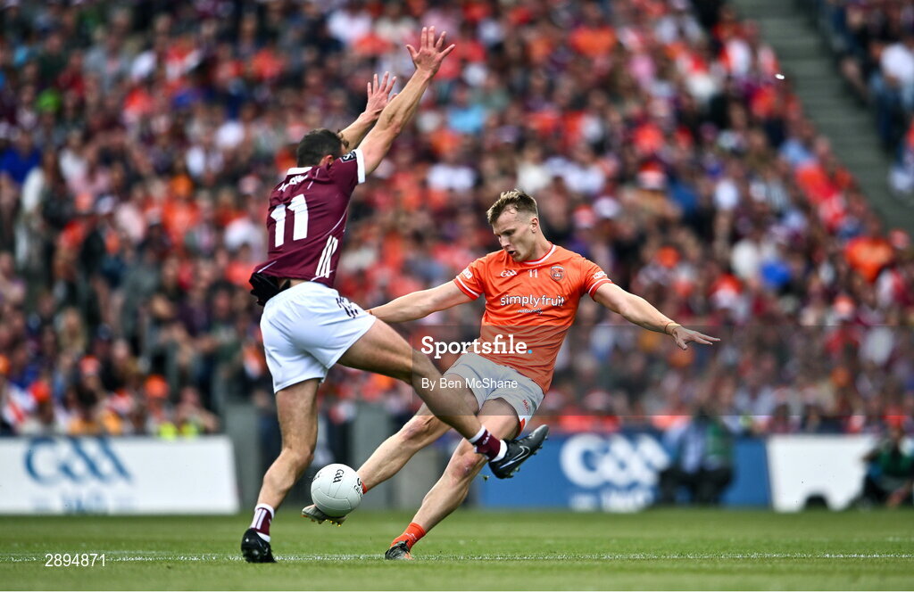 28 July 2024; Rian O'Neill of Armagh in action against John Maher of Galway during the GAA Football All-Ireland Senior Championship Final match between Armagh and Galway at Croke Park in Dublin. Photo by Ben McShane/Sportsfile